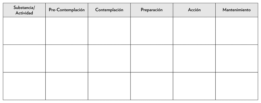 En el cuadro de abajo enlista las sustancias y actividades con los que puedas tener una lucha adictiva. Después, coloca una “x” debajo de la etapa que mejor represente donde te encuentras.
